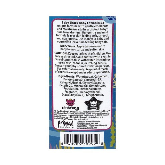 Baby Shark Baby Lotion has a unique formula with gentle emollients and moisturizers to help protect baby's skin from dryness. Our gentle and mild formula leaves skin feeling soft, smooth, and non-greasy. Use it on your baby and yourself to leave skin feeling baby soft.